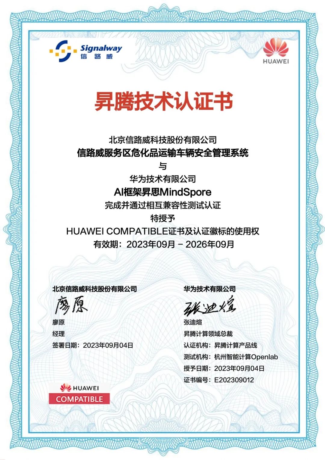 近日,信路威服務(wù)區(qū)?;愤\(yùn)輸車輛安全管理系統(tǒng)與華為AI框架昇思MindSpore、Atlas 800推理服務(wù)器(型號(hào)3000)、Atlas 800訓(xùn)練服務(wù)器(型號(hào)9000)的相互兼容性測試,可充分滿足相關(guān)行業(yè)安全性、可靠性、穩(wěn)定性的應(yīng)用需求,信路威獲得了HUAWEI COMPATIBLE 證書及認(rèn)證徽標(biāo)的使用權(quán)。