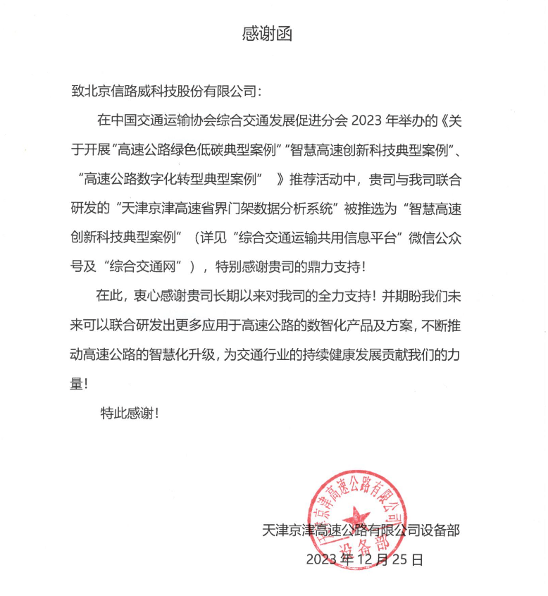 “天津京津高速省界門架數(shù)據(jù)分析系統(tǒng)”由天津京津高速公路有限公司與信路威聯(lián)合研發(fā)。