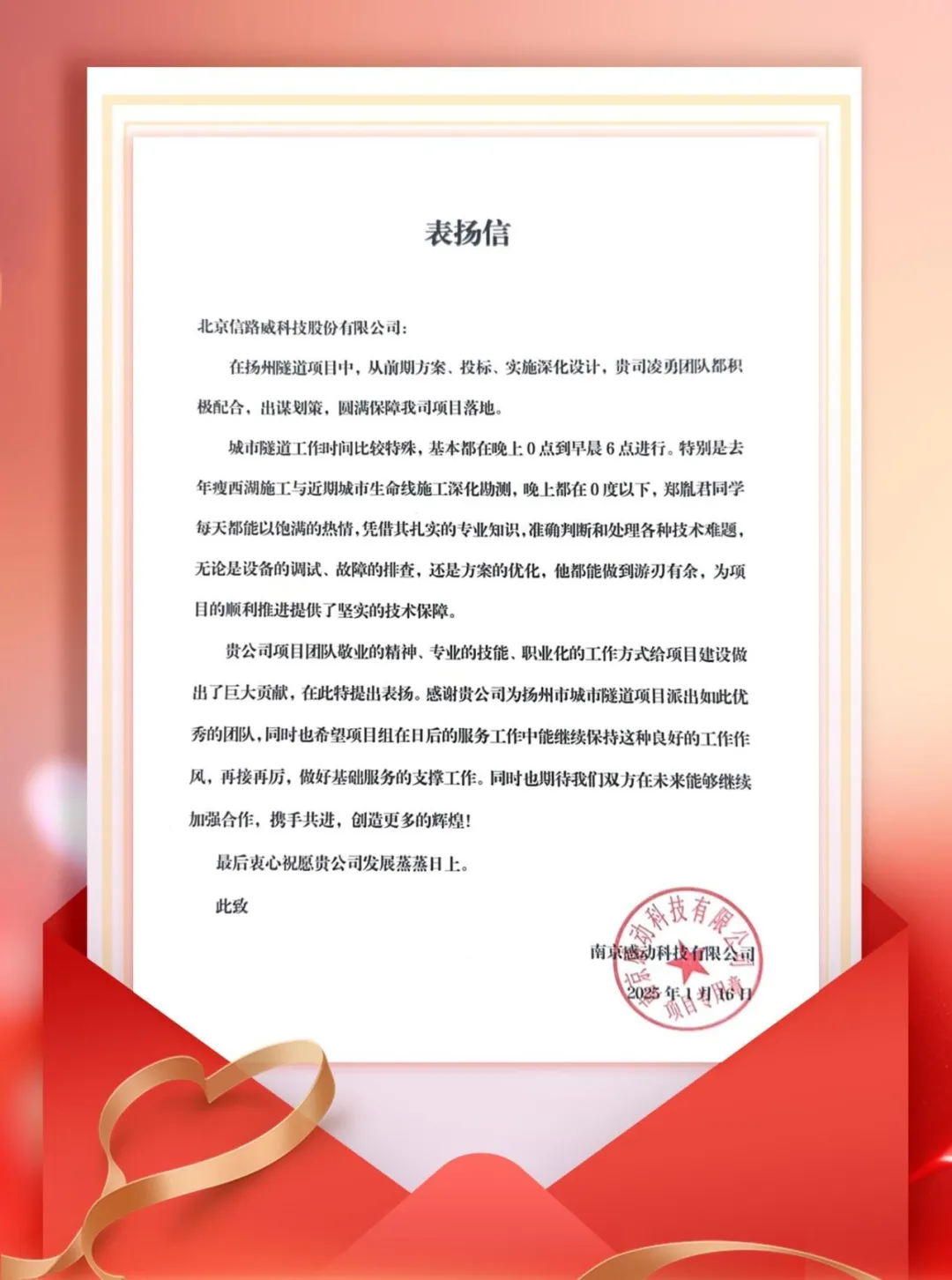 近日,信路威收到南京感動(dòng)科技有限公司發(fā)來的表揚(yáng)信。信中對信路威項(xiàng)目團(tuán)隊(duì)在揚(yáng)州隧道項(xiàng)目建設(shè)過程中體現(xiàn)出的專業(yè)技術(shù)水平進(jìn)行了點(diǎn)贊,對項(xiàng)目組技術(shù)人員在艱難條件下兢兢業(yè)業(yè)的工作熱情給予了高度評價(jià)和贊譽(yù)。