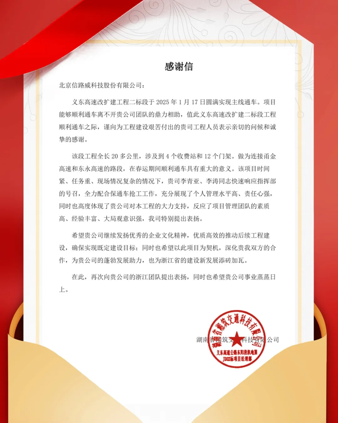 近日,信路威收到了來自客戶湖南省湘筑交通科技有限公司的感謝信。信中對(duì)在義東高速改擴(kuò)建工程建設(shè)努力付出的信路威項(xiàng)目團(tuán)隊(duì)表示了誠(chéng)摯的感謝,這封感謝信是對(duì)信路威項(xiàng)目團(tuán)隊(duì)專業(yè)能力和服務(wù)精神的最好見證。