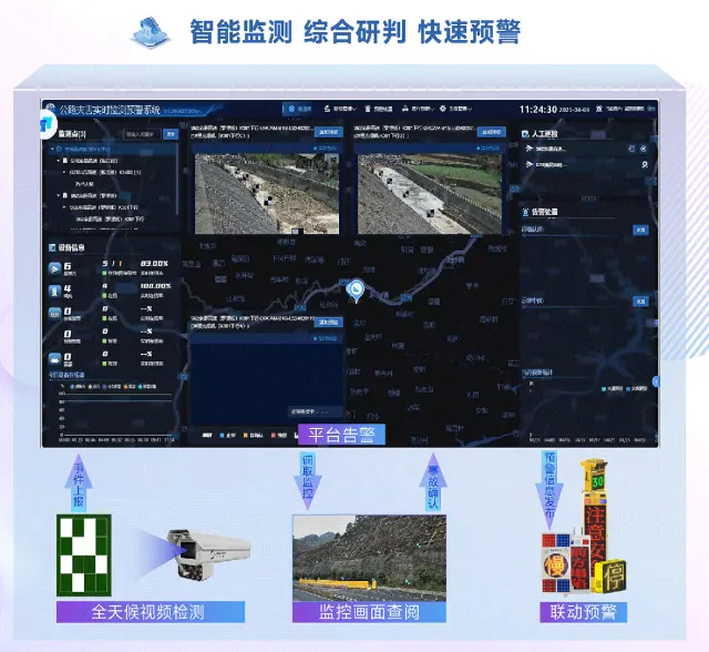 針對公路邊坡與橋梁等結(jié)構(gòu)的安全隱患,信路威推出公路災害(邊坡/橋梁)預警系統(tǒng)。該系統(tǒng)采用微光靶標與超黑光AI相機,實現(xiàn)全天候精準監(jiān)測,實時感知結(jié)構(gòu)形變。當系統(tǒng)檢測到異常時,立即觸發(fā)“AI監(jiān)控報警-云端確認與處置-現(xiàn)場聲光示警聯(lián)動”三級響應(yīng)機制,快速提醒監(jiān)控人員處理,并聯(lián)動現(xiàn)場示警設(shè)備。通過開啟紅藍閃爍燈、高亮LED屏及語音播報等多模態(tài)預警手段,主動引導后續(xù)車輛,提示前方道路異常,有效提升行車安全。事件處置完成后,系統(tǒng)會自動生成詳細報告。