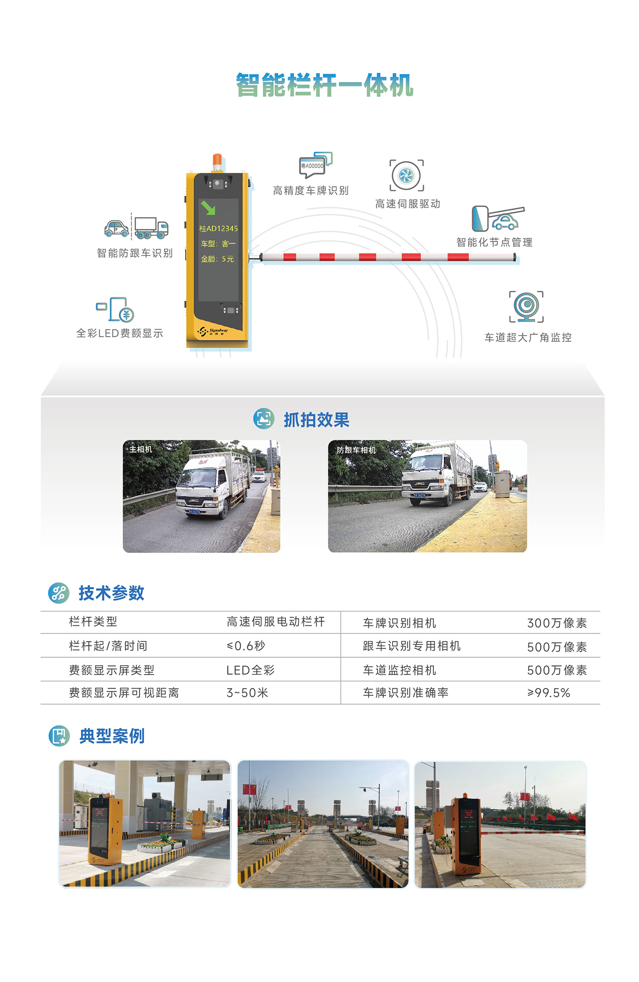 公司自主研發(fā)的智能欄桿一體機,主要由高速欄桿機、費額顯示屏、車牌識別相機、防跟車相機、車道監(jiān)控相機及多個補光燈組成,集圖像采集、車輛檢測、車道視頻監(jiān)控、車牌識別、費額顯示、高速欄桿于一體,集成化減少了對收費島的占地要求,使得車道機電系統(tǒng)維護更便捷,適用于高速公路收費站收費車道。