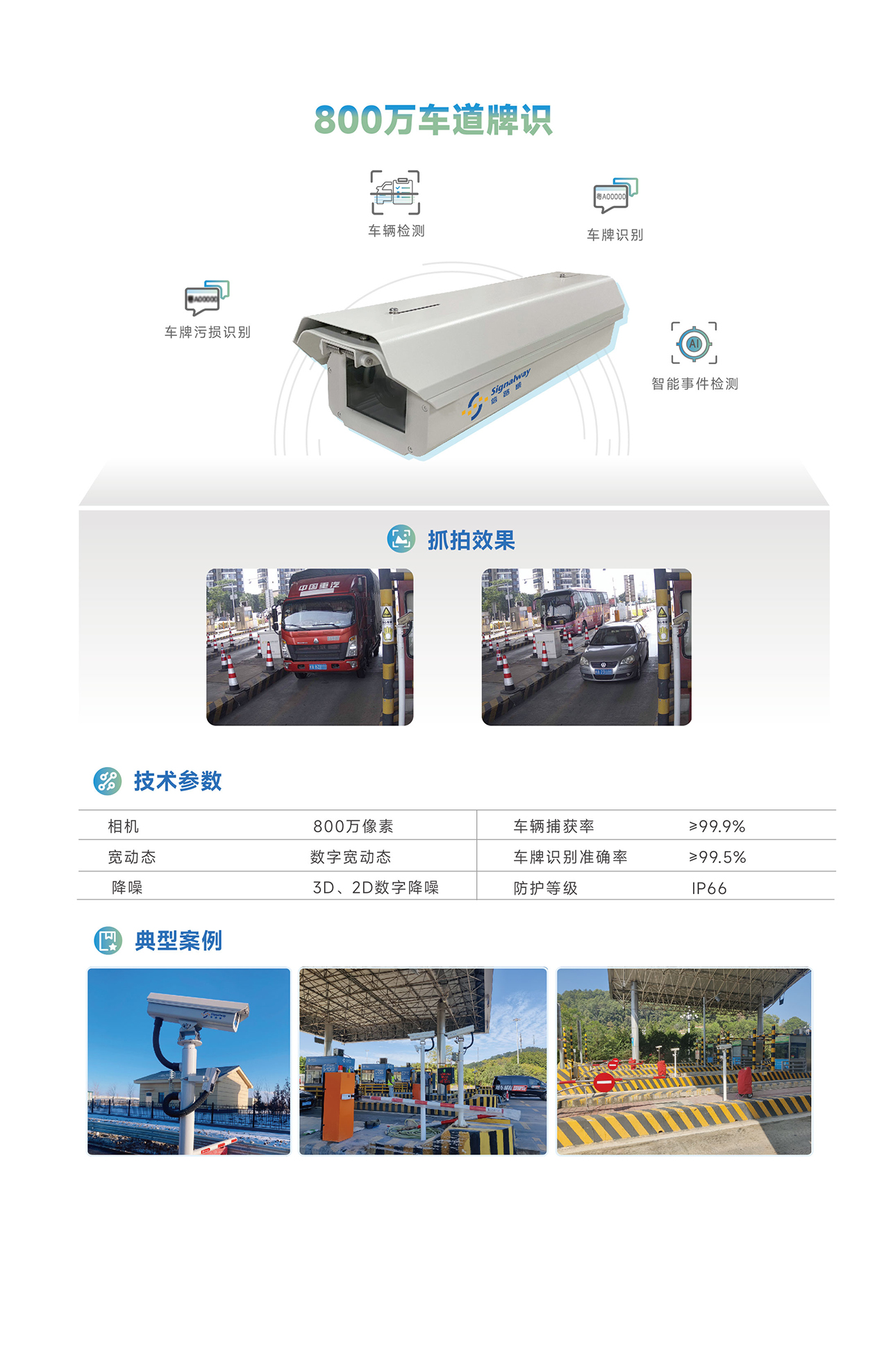 公司自主研發(fā)的800萬像素智能一體機,集圖像采集、車輛檢測、車牌識別、視頻監(jiān)控于一體,一個設(shè)備管理一個收費車道,安裝調(diào)試簡單,主要用于高速公路收費應(yīng)用方案。