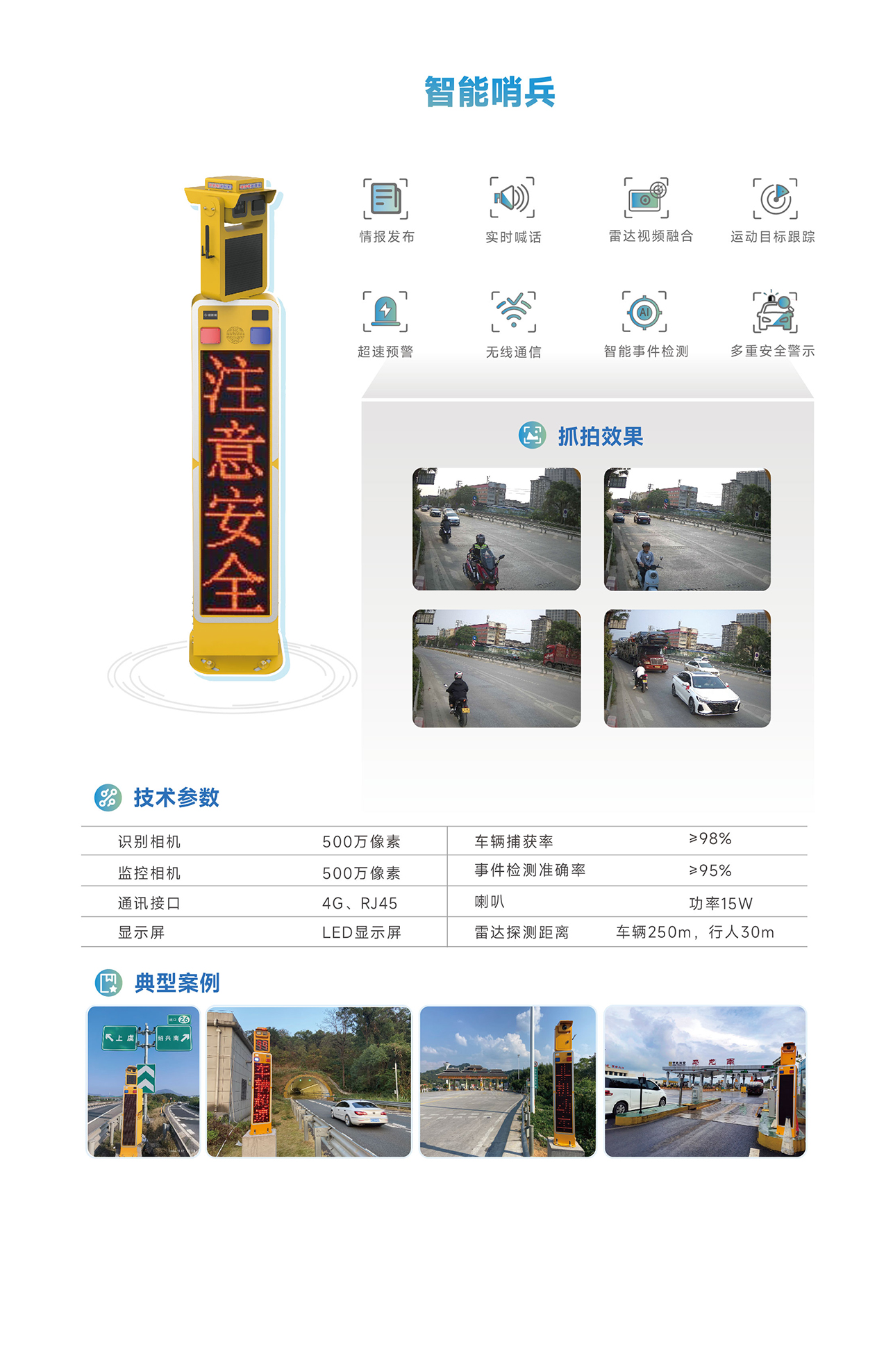 高速智能哨兵具有行人檢測、車輛檢測、車牌識別、超速預警、AI事件檢測、視頻監(jiān)控、告警信息展示(LED屏幕、語音、警示燈)等主要功能,實現(xiàn)行人、非機動車、機動車的實時檢測,并進行精準警示及主動告警,適用收費站入口匝道、公路分/合流匝道口、隧道口、邊坡/橋梁/高危路段等場景。