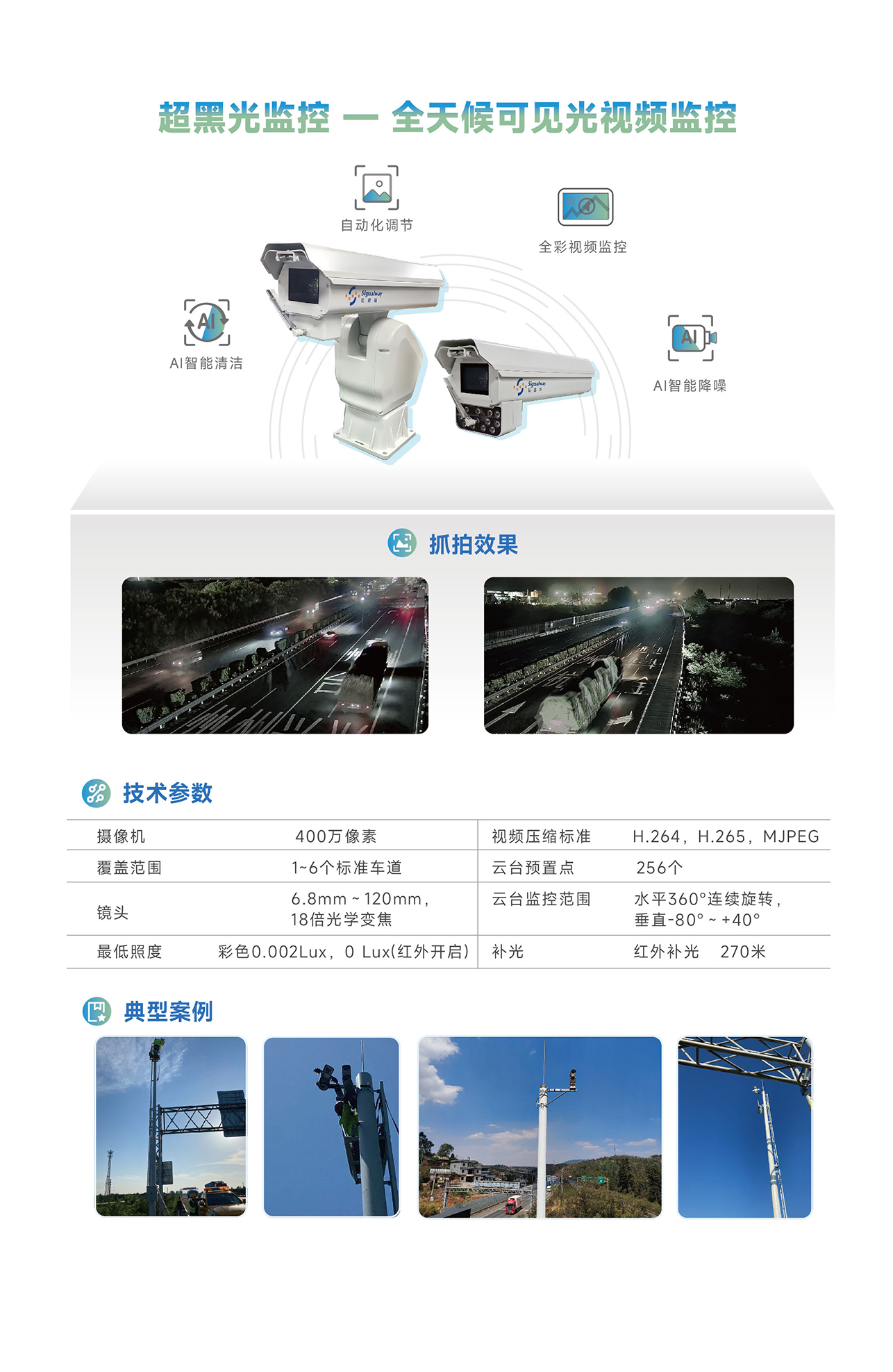 信路威針對(duì)高速公路夜間監(jiān)控的通電,潛心研發(fā),成功研發(fā)出了“慧影”三代技術(shù),無(wú)需借助外界補(bǔ)光技術(shù)就能實(shí)現(xiàn)高速公路夜間清晰監(jiān)控目的,讓高速公路實(shí)現(xiàn)全天候的監(jiān)控成為現(xiàn)實(shí),可大大提升高速公路安全運(yùn)營(yíng)能力。無(wú)需外部補(bǔ)光,具有高清、全彩視頻監(jiān)控功能,圖像清晰明亮,在低照度環(huán)境下實(shí)現(xiàn)監(jiān)控畫(huà)面“亮、凈、彩”的效果。