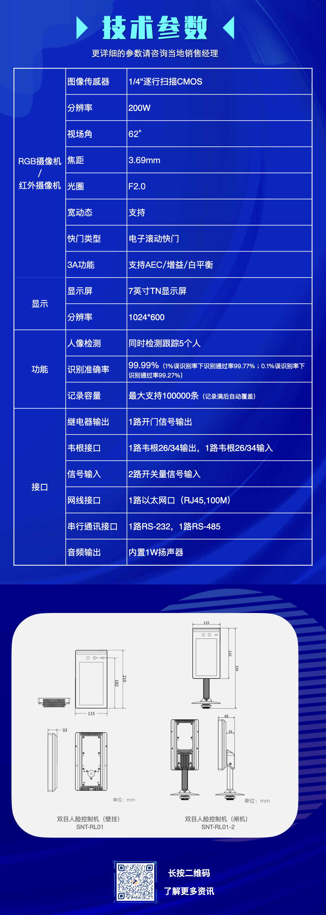 SNT-RL01/SNT-RL01-2是一款高性能、高可靠性的人臉控制機,依托深度學習算法,具有識別速度快、準確率高的特點。支持人像識別1:1 和1:N 模式,支持外接刷卡模塊。