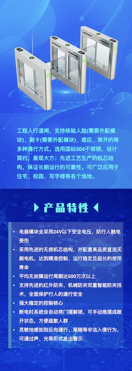 防撞擺閘支持核驗(yàn)人臉(需要外配模塊)、刷卡(需要外配模塊)、感應(yīng)、常開的等多種通行方式。選用國(guó)標(biāo)304不銹鋼,設(shè)計(jì)簡(jiǎn)約,美觀大方;先進(jìn)工藝生產(chǎn) 的機(jī)芯結(jié)構(gòu),保證長(zhǎng)期運(yùn)行的可靠性??蓮V泛應(yīng)用于住宅、校園、寫字樓等各個(gè)場(chǎng)地。