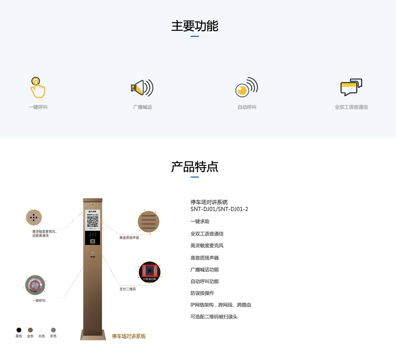 停車場(chǎng)對(duì)講系統(tǒng)是用于無(wú)人值守停車場(chǎng)等方案中的機(jī)器人呼叫系統(tǒng)。一鍵報(bào)警/求助、雙向?qū)χv、掃碼支付等具有多功能產(chǎn)品。